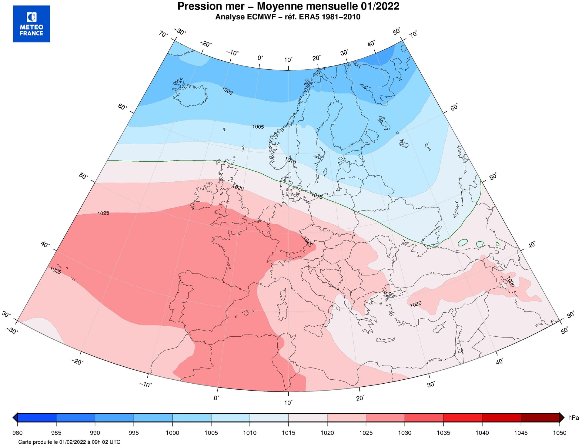Pression atmosphérique moyenne - janvier 2022 - Météo-France - Twitter Gaetan Heymes