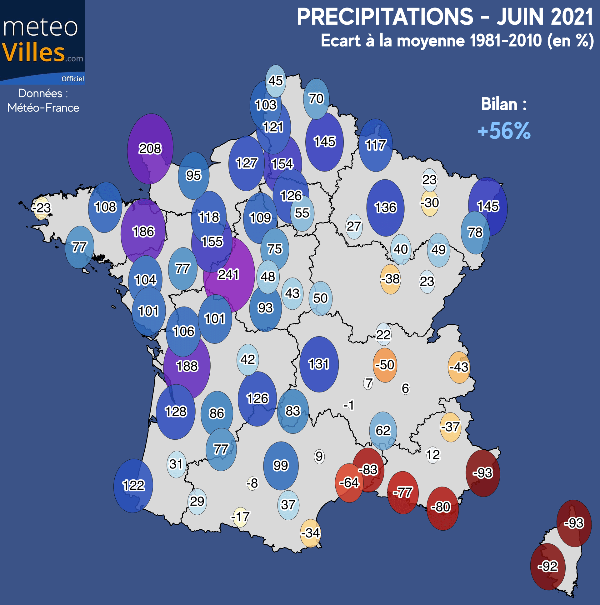 Malgré une impression générale de mois de juin plus frais que la normale en raison d'une instabilité très récurrente et parfois violente, l'anomalie thermique par rapport à la moyenne 1981-2010 atteint +2.0°C, ce qui place juin 2021 en 5ème position des mois de juin les plus chauds depuis 1950, devant juin 2019 qui avait pourtant connu une canicule exceptionnelle.