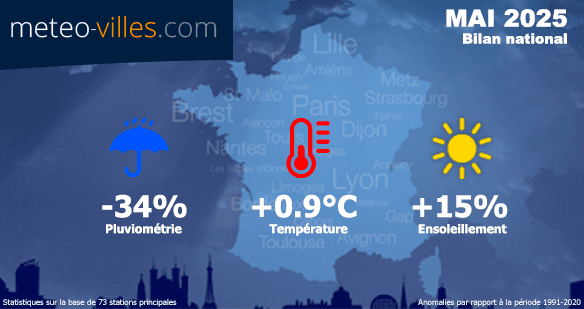 Comme à chaque début de mois, nous vous proposons un nouveau bilan climatologique. Place désormais au bilan cartographié de MAI 2025 en termes de température, pluviométrie et ensoleillement sur un panel de 73 stations*. Les anomalies présentées sont calculées à partir des moyennes climatiques de la période de référence 1991-2020 sur l'ensemble des stations du panel.