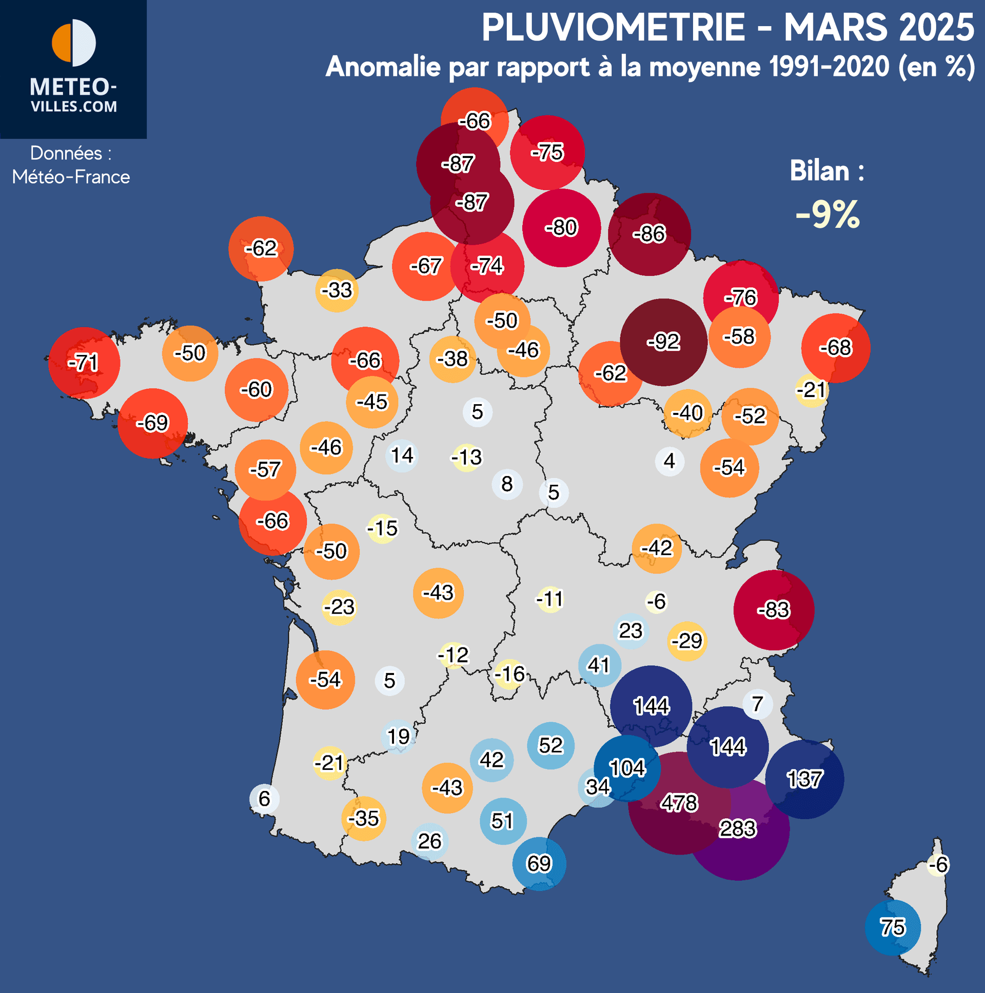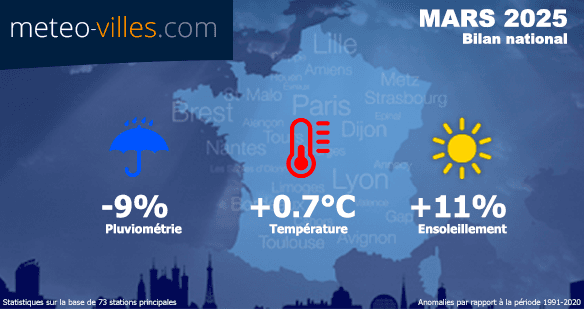 Comme à chaque début de mois, nous vous proposons un nouveau bilan climatologique. Place désormais au bilan cartographié de MARS 2025 en termes de température, pluviométrie et ensoleillement sur un panel de 73 stations*. Les anomalies présentées sont calculées à partir des moyennes climatiques de la période de référence 1991-2020 sur l'ensemble des stations du panel.