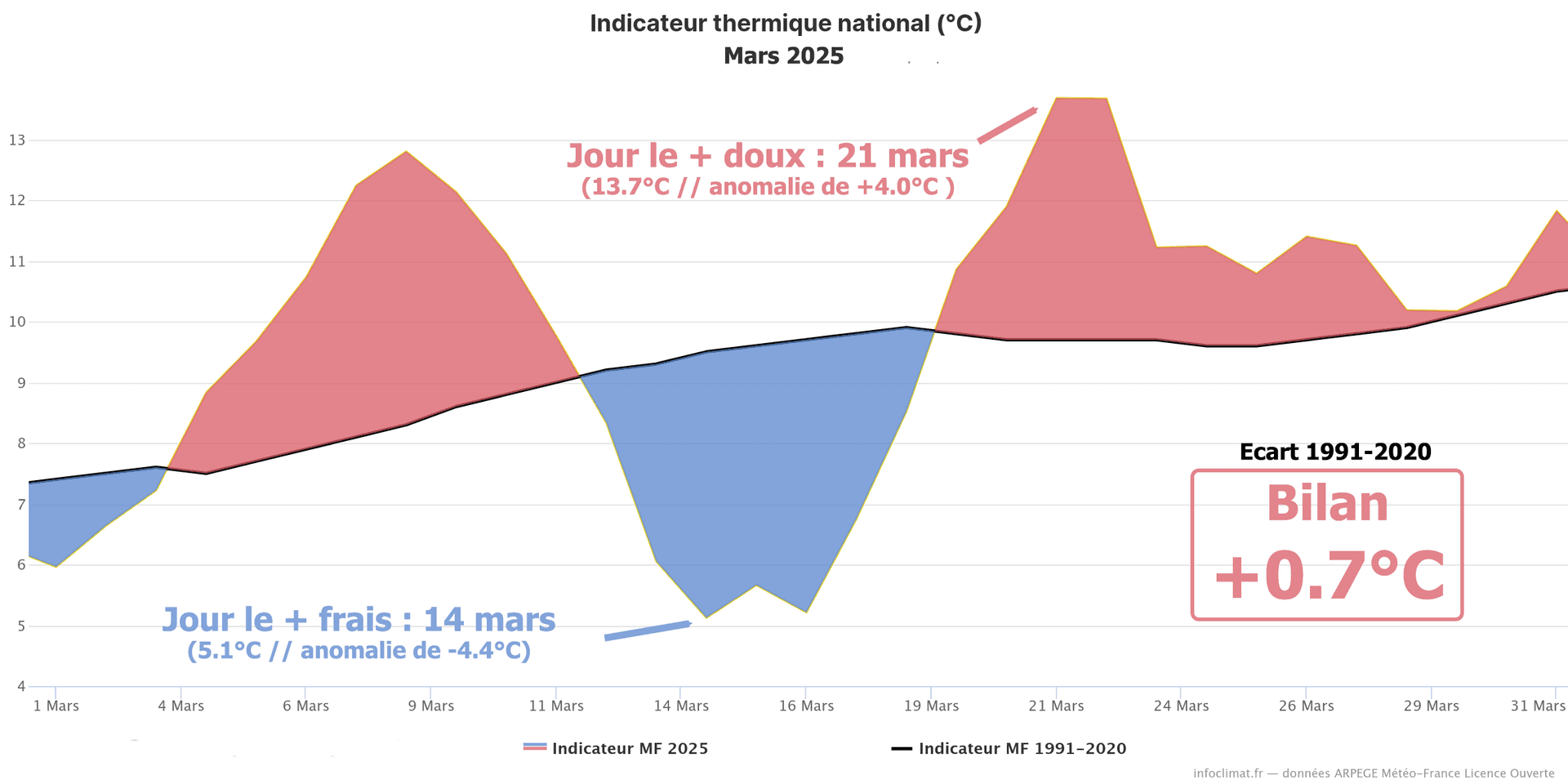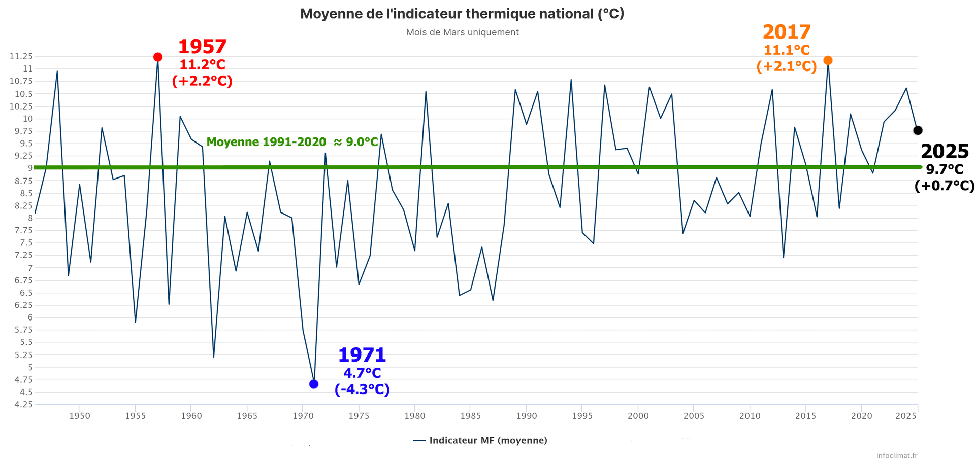 Indicateur thermique national pour mars 2025 depuis l'après-guerre (1946) - Infoclimat