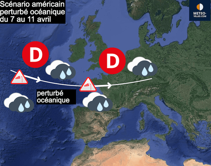 Un basculement océanique très perturbé se produirait du 7 au 11 avril selon le modèle météo américain (en total désaccord avec le modèle météo européen qui indique au contraire un temps beaucoup plus calme) - carte meteo-villes.com