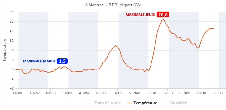 De par son climat bien plus continental que celui de l'Europe, l'Amérique du Nord est donc exposée à des contrastes thermiques nettement plus importants, qui caractérisent l'été indien. Ainsi, il n'est pas rare que d'impressionnants redoux automnaux se produisent après l'observation des premiers flocons. Le graphique ci-dessous en est un bon exemple. À Montréal, il ne faisait pas plus de 1,5°C le 3 novembre 2020. Deux jours plus tard, le thermomètre affichait 20,6°C, soit une hausse de 19°C en 48 heures ! À ce titre, n'hésitez pas à lire notre article sur le climat surprenant du Québec >>>