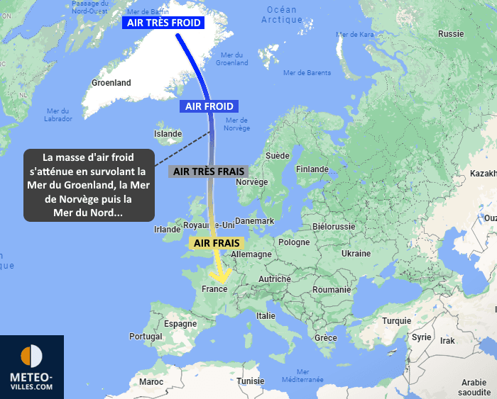 Schéma montrant l'atténuation de l'air froid entre le Groenland et la France - Météo Villes