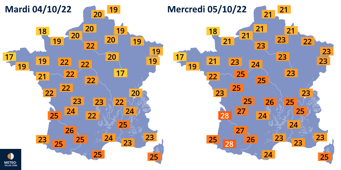 Températures maximales prévues les mardi 4 et mercredi 5 octobre 2022 - Météo Villes
