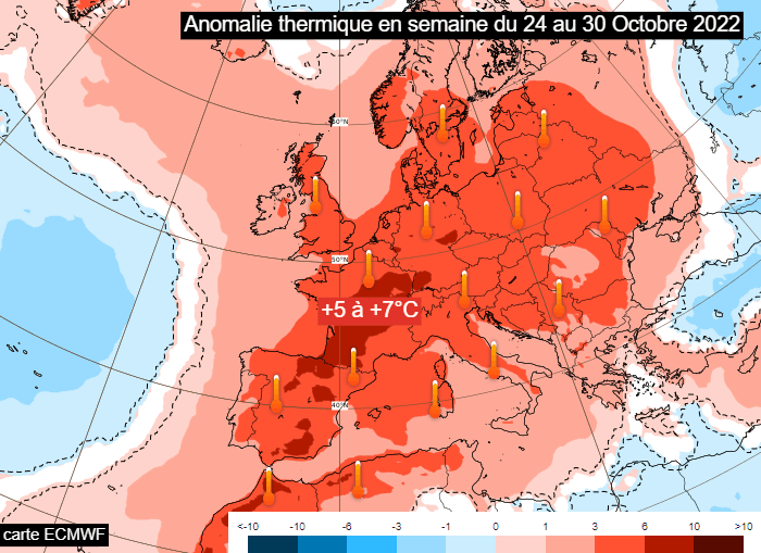Ainsi, c'est une anomalie thermique spectaculaire qui nous attend d'ici la fin du mois. Sur cette semaine du lundi 24 au dimanche 30 octobre 2022, l'excédent thermique moyen devrait être de +5 à +7°C en France, des niveaux remarquables ! Les après-midi offriront des sensations estivales mais il faut aussi préciser que les nuits seront anormalement douces. Les températures minimales seront parfois supérieures aux valeurs que nous devrions avoir l'après-midi à la fin octobre !