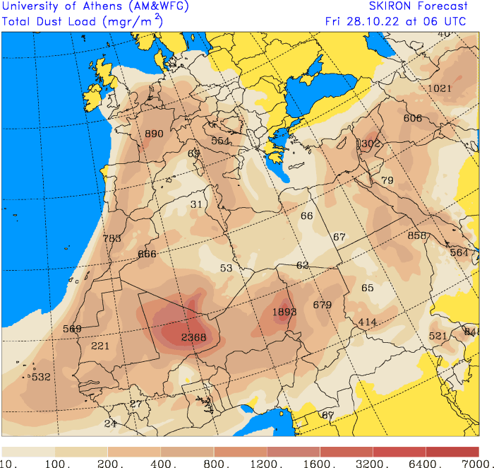 Prévision des concentrations en sable pour le vendredi 28 octobre 2022 – via SKIRON