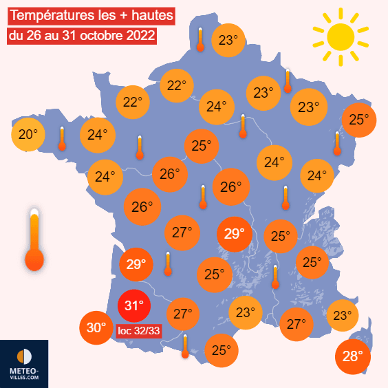 Valeurs les plus hautes attendues entre le mercredi 26 au lundi 31 octobre 2022 – Météo Villes
