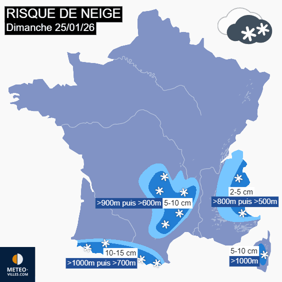 Un nouveau front circulera du sud-ouest vers les Alpes dimanche 25 janvier 2026. Il donnera 10 à 15 cm en moyenne (loc. 20 cm) dans les Pyrénées avec une limite pluie/neige s'abaissant de 1000 vers 700 mètres. Sur le Massif Central, on attend 5 à 10 cm avec des chutes de neige tombant d'abord vers 900 mètres puis s'abaissant vers 600 mètres le soir. Dans les Alpes, le front donnera des cumuls plus maigres mais la limite pluie/neige pourra descendre vers 500 mètres le soir. Notons aussi 5 à 10 cm sur le relief corse dès 1000 mètres.
