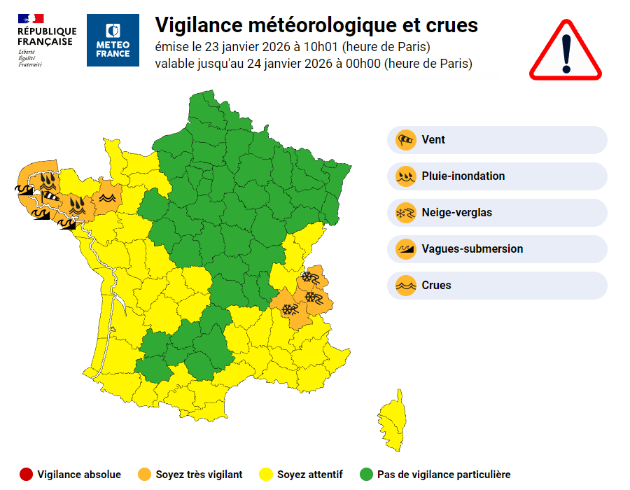Carte de vigilance en vigueur ce vendredi 23 janvier 2026 - Météo France