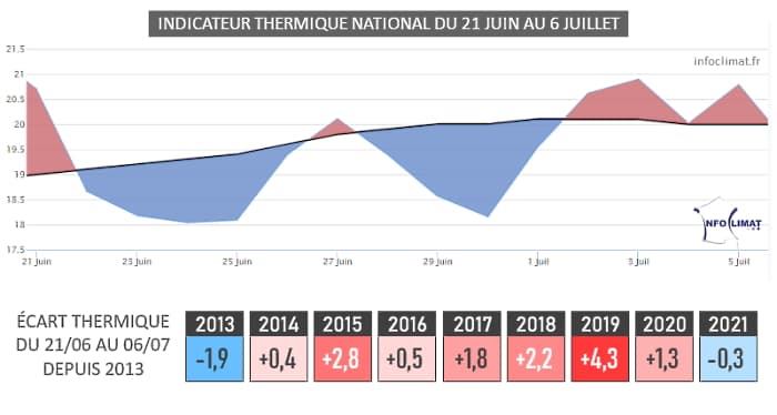 Cependant, ce déficit thermique est à relativiser tant il est faible. En effet, les 3 dixièmes sous les normales à échelle nationale sont loin du déficit de 1,9°C observé aux mêmes dates au début de l'été 2013, qui fut sensiblement plus frais et humide sur la France. Soulignons cependant que les régions du nord enregistrent un déficit plus net que celles du sud en ce début d'été 2021, marqué par une chaleur quasi-absente sur les secteurs septentrionaux de l'hexagone.