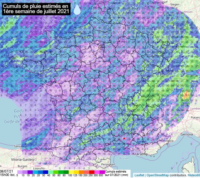 La circulation de plusieurs anomalies dépressionnaires à proximité de la France nous vaut un début juillet 2021 assez humide. Toutes les zones en bleu sur la carte ci-dessus ont reçu plus de 20 mm sur la première semaine du mois et des cumuls supérieurs à 50 mm ont d'ores et déjà été enregistrés sur le centre-est du pays (zones en vert).