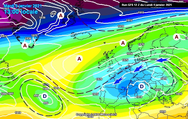 Situation à échelle continentale au 5 janvier 2021 - via meteociel.fr