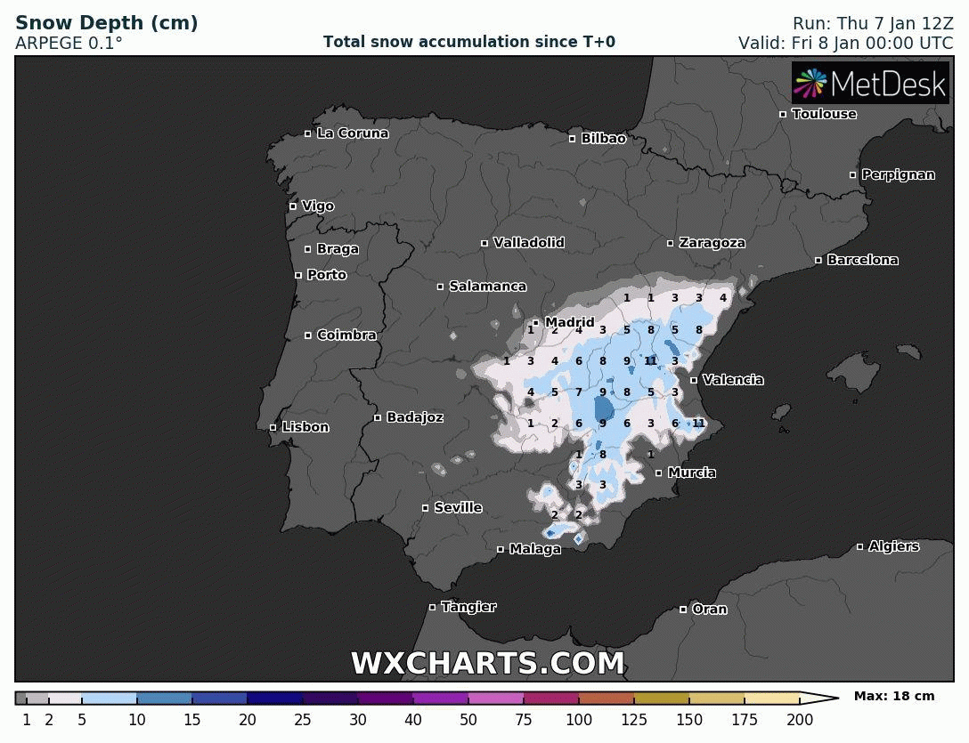 Une dépression actuellement située au nord-ouest des côtes africaines va se décaler vers Gibraltar ce vendredi 8 janvier 2021 avant de progresser lentement vers les Baléares le samedi 9 puis de terminer sa course entre le golfe de Gênes et l'Italie le dimanche 10 janvier. En circulant très lentement, cette dépression va générer un épisode neigeux de grande ampleur sur de vastes régions espagnoles, pouvant déborder sur l'extrême sud de la France.