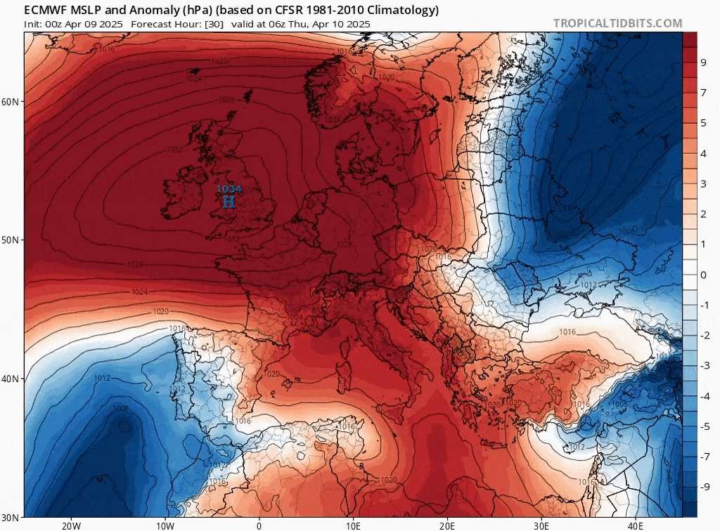 Pression du jeudi 10 au dimanche 13 avril 2025 (bleu = dépressionnaires, rouge = anticycloniques) - tropicaltidbits.com
