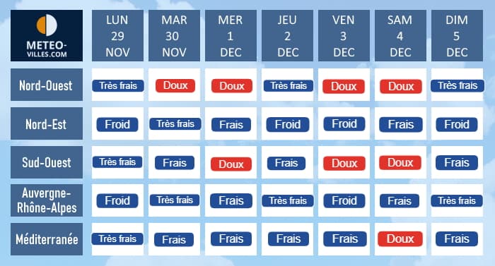 Prévisions des températures pour la semaine du lundi 29 novembre au dimanche 5 décembre 2021 - Météo Villes