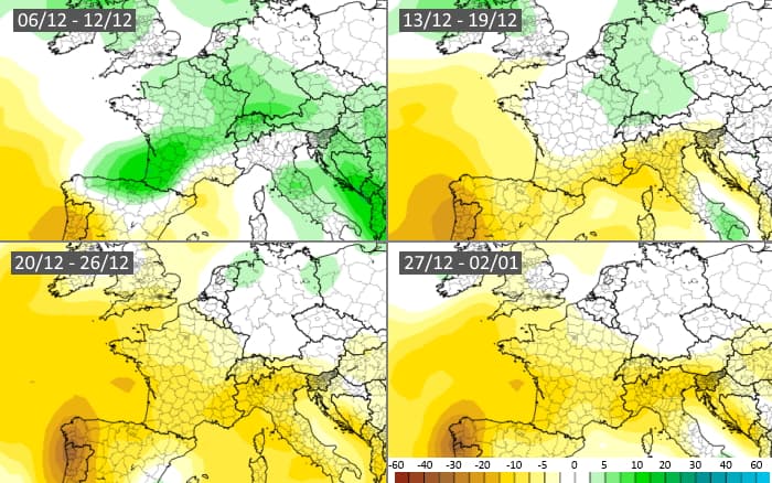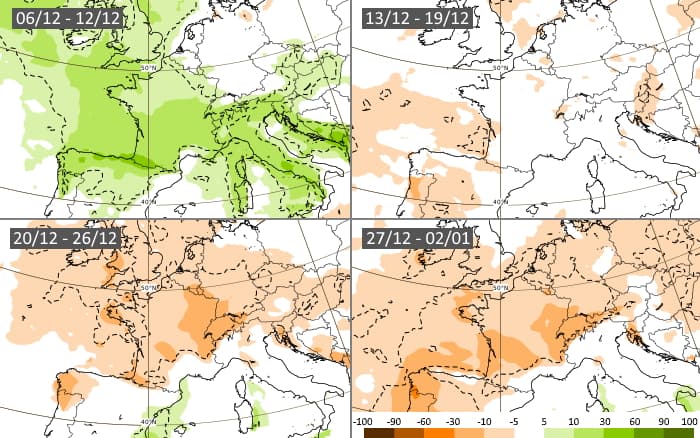 Projection de l'anomalie pluviométrique en France en décembre 2021 - Météo Villes