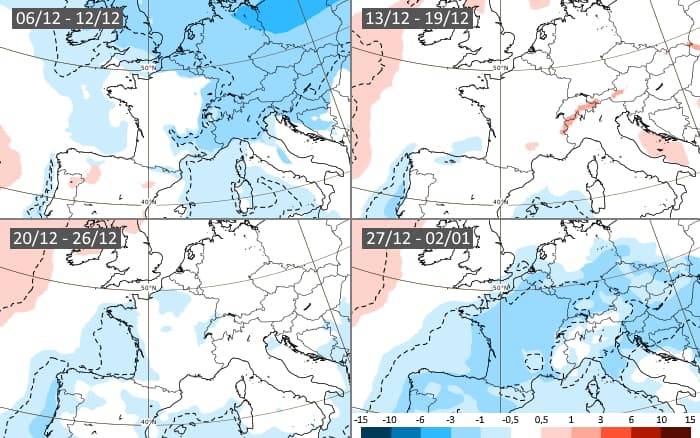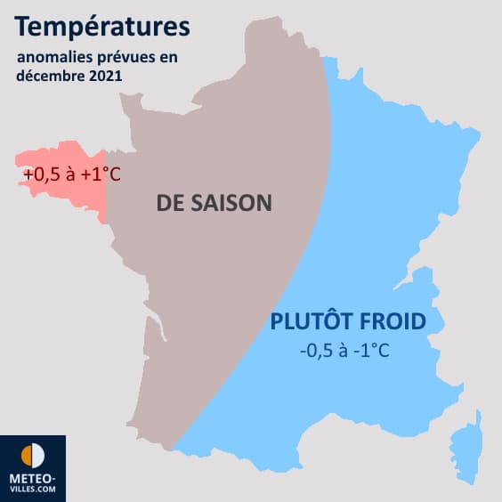 Le modèle européen envisage des températures proches des normales sur l'ouest de la France durant la semaine du 6 au 12 décembre 2021 tandis que des anomalies froides resteraient au programme sur le nord et l'est du territoire. La mi-décembre pourrait ensuite être dans les normales avant qu'une nouvelle tendance froide ne se dessine au cours de la dernière décade du mois, s'affirmant pour les derniers jours de l'année 2021.