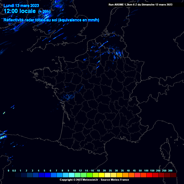 Prévision des précipitations - après-midi et soirée du lundi 13 mars 2023 - Modèle Arome via Météociel
