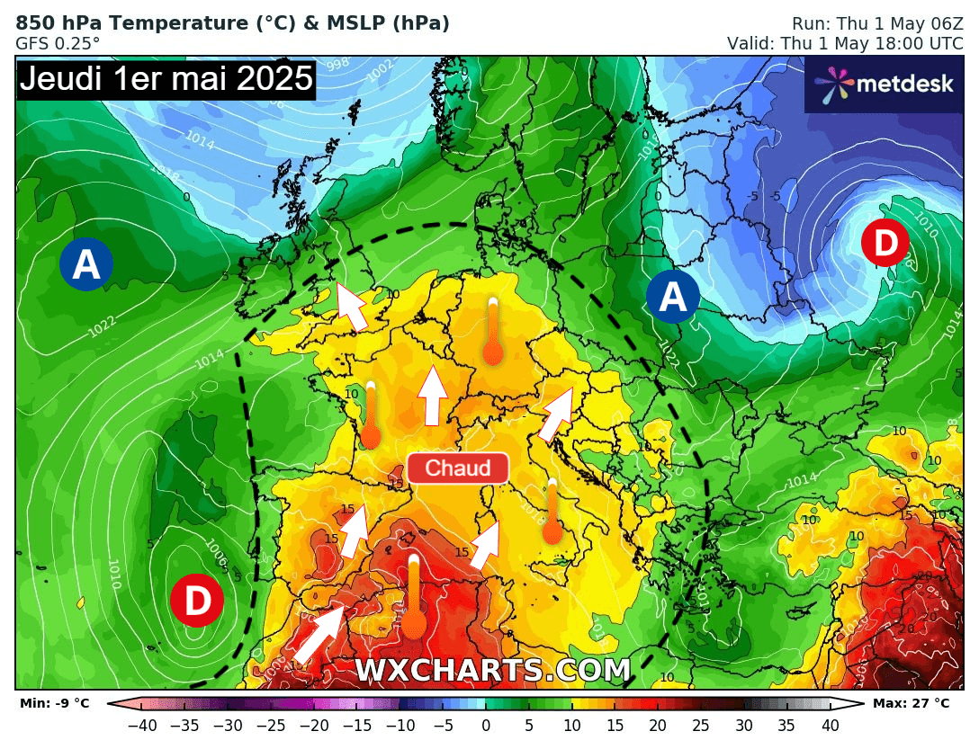 Schéma de la situation atmosphérique du 1er mai 2025 sur l'Europe – Modèle GFS via WX CHARTS