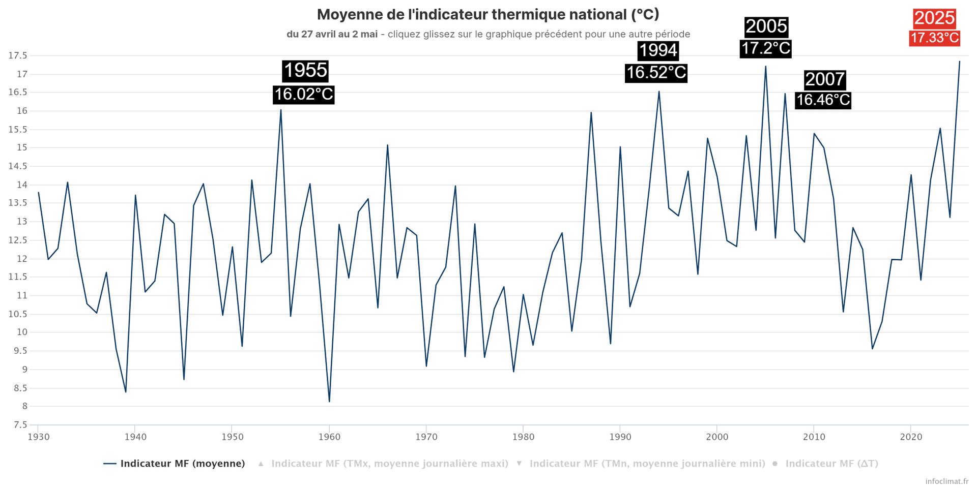 Indicateur thermique national pour la période du 27 avril au 2 mai 2025 depuis 1930 – via Infoclimat.fr