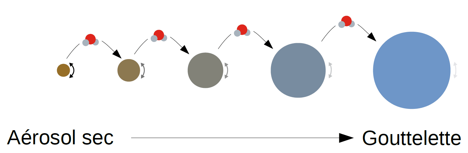 Schéma de formation d'une gouttelette d'eau à partir d'un aérosol solide (comme du sable du Sahara) - schéma Benoit Vié