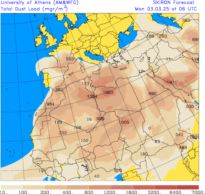 Concentrations de poussières de sable du Sahara du lundi 3 au dimanche 9 mars 2025 - SKIRON