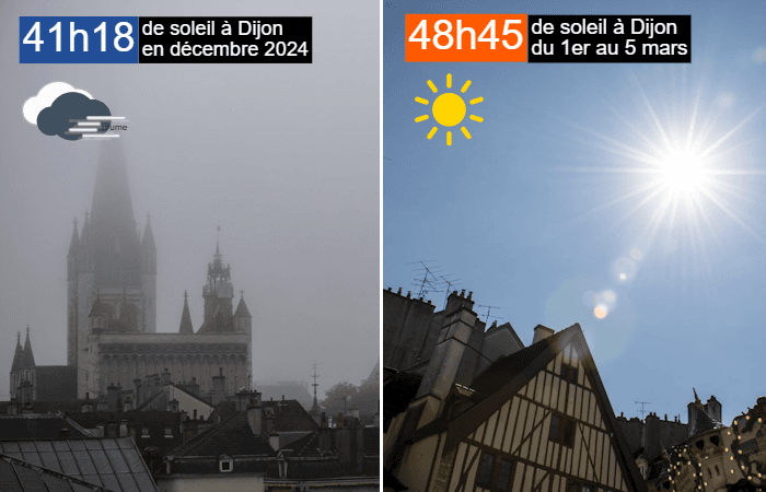 Ensoleillement à Dijon en décembre 2024 et du 1er au 5 mars 2025 - Météo Villes
