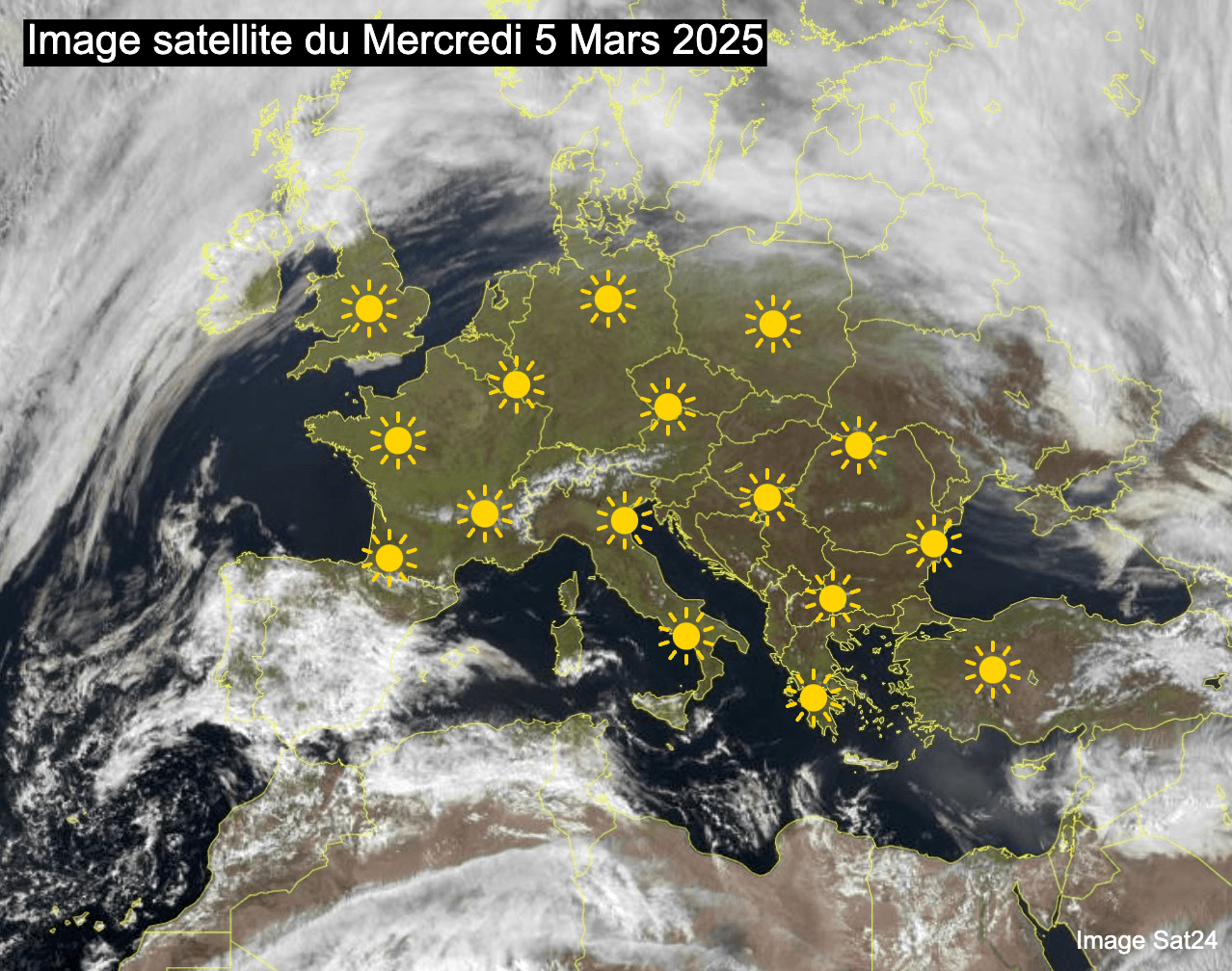Ainsi, cette anticyclone peut être qualifié de printanier puisqu'il rime avec soleil et douceur. D'ailleurs, l'image satellite de ce mercredi 5 mars 2025 est marquante. On constate que le ciel est presque totalement dégagé sur près de 2000 kilomètres entre l'Angleterre et la Turquie, si bien que de très nombreux pays - dont la France - profitent d'un ciel tout bleu et d'un ensoleillement optimal !