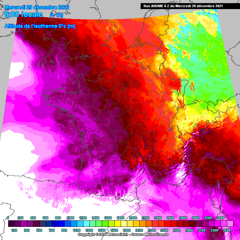 Altitude de l'isotherme 0°C les mercredi 29 et jeudi 30 décembre 2021 - via meteociel.fr