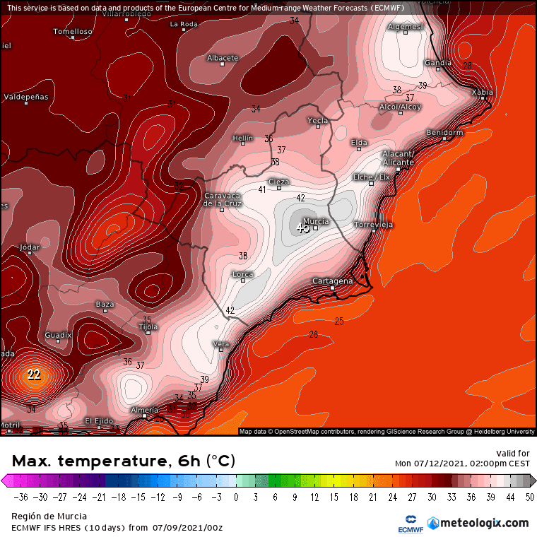 Températures maximales prévues le Sud-Est de l’Espagne ce lundi 12 juillet 2021 – Modèle ECMWF HIRES via meteologix