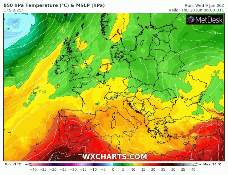 Animation de la masse d'air à 850 hPa du 10 au 17 juin 2021 - via wxcharts.com