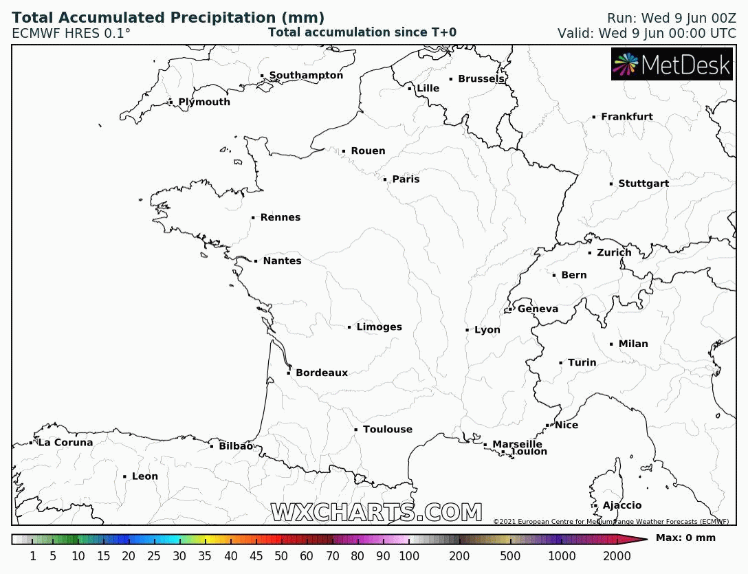 Venant d'une affirmation des hautes pressions sous un flux continental, cette chaleur rimera avec un temps sec et généreusement ensoleillé sur la plupart des régions. La carte ci-dessus montre les cumuls de pluie envisagés jusqu'au mercredi 16 juin 2021. On constate que les pluies modélisées sont essentiellement les averses orageuses touchant l'est de la France ce 9 juin et qui vont se raréfier dès la journée du jeudi 10 juin.
