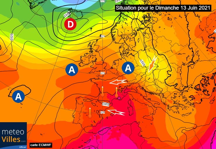 L'épisode de fortes chaleurs continuera de s'affirmer durant les après-midi du dimanche 13 et du lundi 14 juin 2021. Il fera alors 27 à 30°C sur le quart nord-est de la France et souvent 30 à 32°C au sud de la Loire. Toutefois, des valeurs de 33 à 35°C sont attendues des plaines du sud-ouest vers le Languedoc. Les valeurs les plus hautes sont modélisées sur l'arrière-pays méditerranéen et notamment vers le Roussillon.