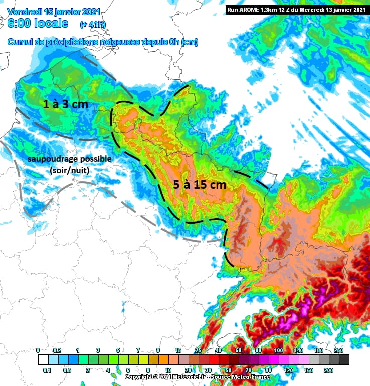 Modélisation des cumuls de neige le jeudi 14 janvier 2021 et la nuit suivante - modèle AROME via meteociel.fr