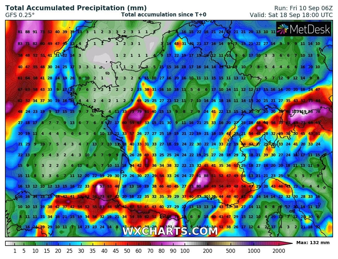 Cumuls de précipitations du 10 au 18 septembre 2021 sur la France – Modèle GFS via WX CHARTS