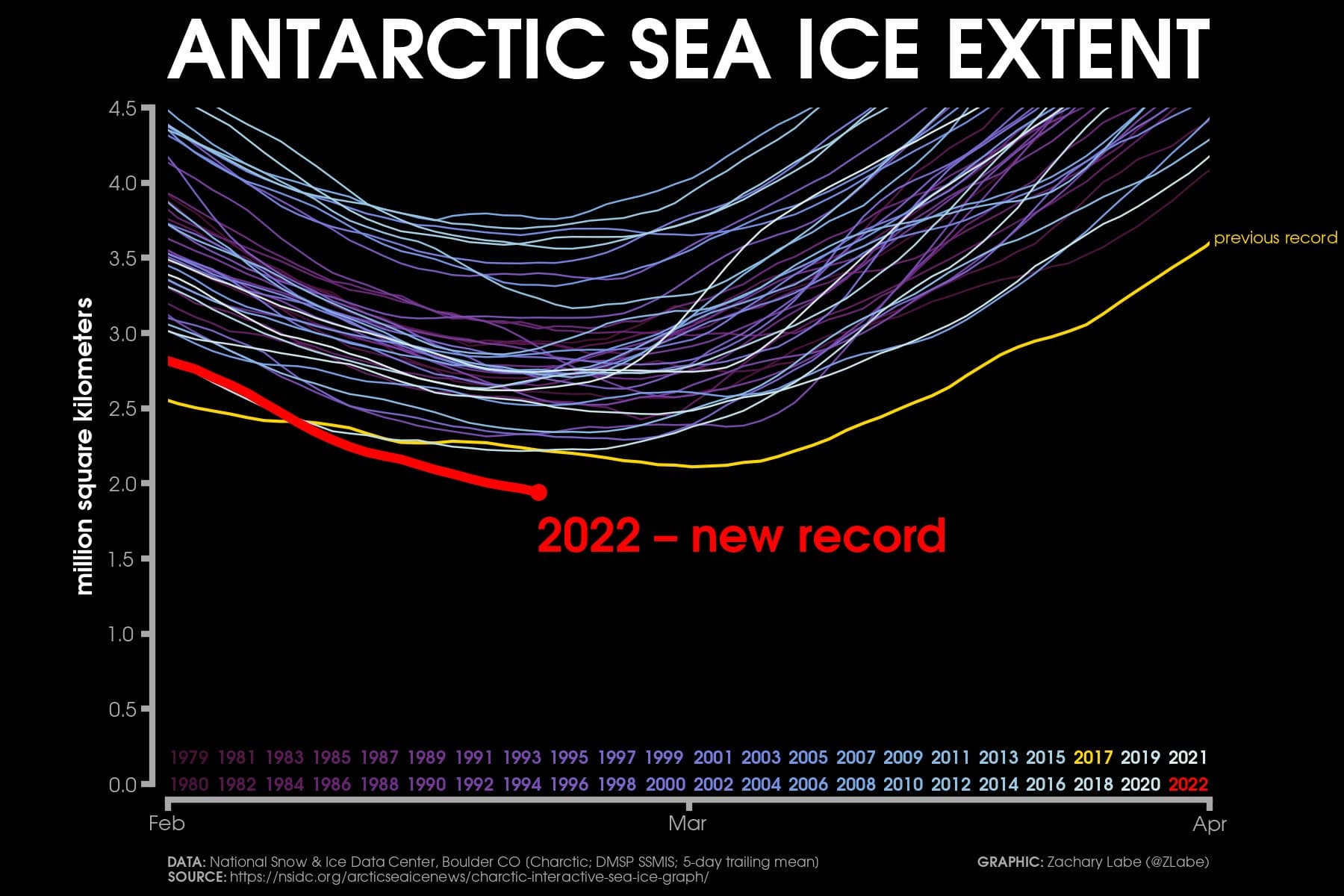 La banquise antarctique atteint généralement son minimum annuel à la fin de l'été austral, soit entre la mi-février et le début du mois de mars avec une moyenne de 2,80millions de km² sur la période 1981-2010. Le record bas était jusqu'à présent détenu par l'année 2017 avec un minimum annuel de 2,17 millions de km² le 3 mars.