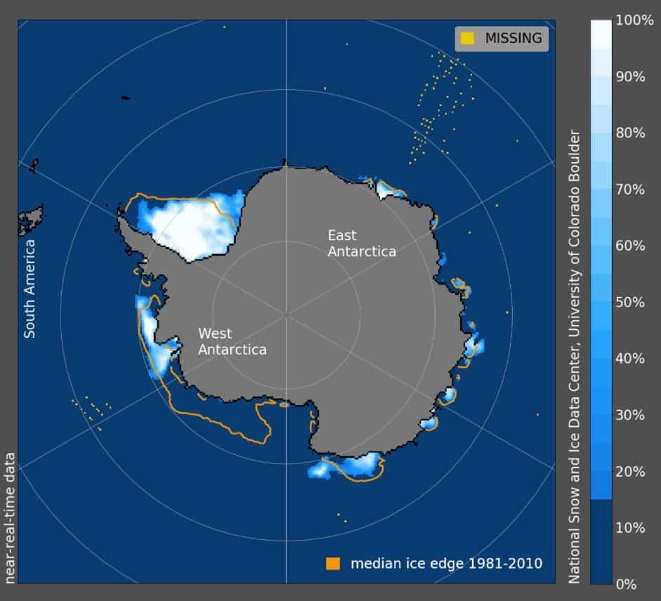 En terme d'emprise de la glace, ce record bas se manifeste notamment par une absence quasi-totale de banquise au niveau de l'océan austral, un événement très peu commun. L'épaisseur est également peu importante sur la majorité du continent,.