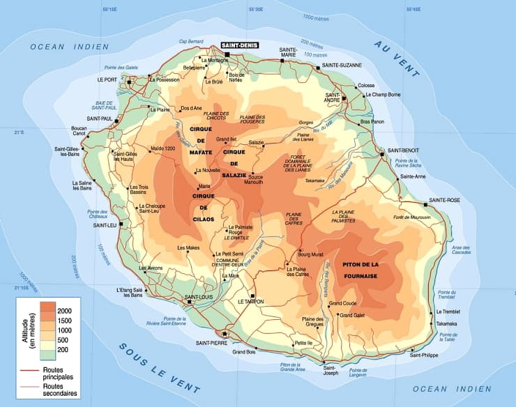 Carte du relief de la Réunion et distinction de la côte au vent et de la côte sous le vent - via A. Lemahieu
