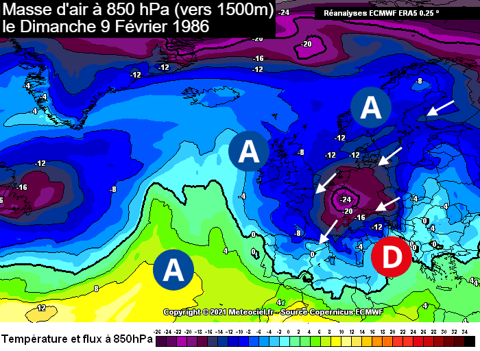 En France, il s'agit du quatrième plus froid observé depuis le début du XXème siècle ! Il affiche une température moyenne de 0,66°C à échelle nationale, une valeur 5,4°C en dessous des normales de saison d'aujourd'hui ! Et pour cause, un blocage anticyclonique s'érige des Îles Britanniques à la Russie et advecte un air continental glacial durant plusieurs semaines. À la fin de la première décade de février 1986, la masse d'air atteint -24°C à 850 hPa (vers 1500m) dans le nord-est de la France, des niveaux remarquablement bas !
