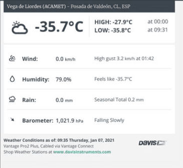 Mais en Espagne, les niveaux observés ont été encore plus exceptionnels. Ce jeudi 7 janvier à 09h31, une température de -35.8°C a été mesurée à 1872m d'altitude par une station semi-professionnelle au lieu-dit Vega de Liordes, dans le massif des Pics d'Europe (région autonome de Castille-et-Leon). Bien que n'appartenant pas au réseau de stations météorologiques officielles de l'AEMET (services météo Espagnols), cette température correspond à un nouveau record absolu "officieux" de froid en Espagne !