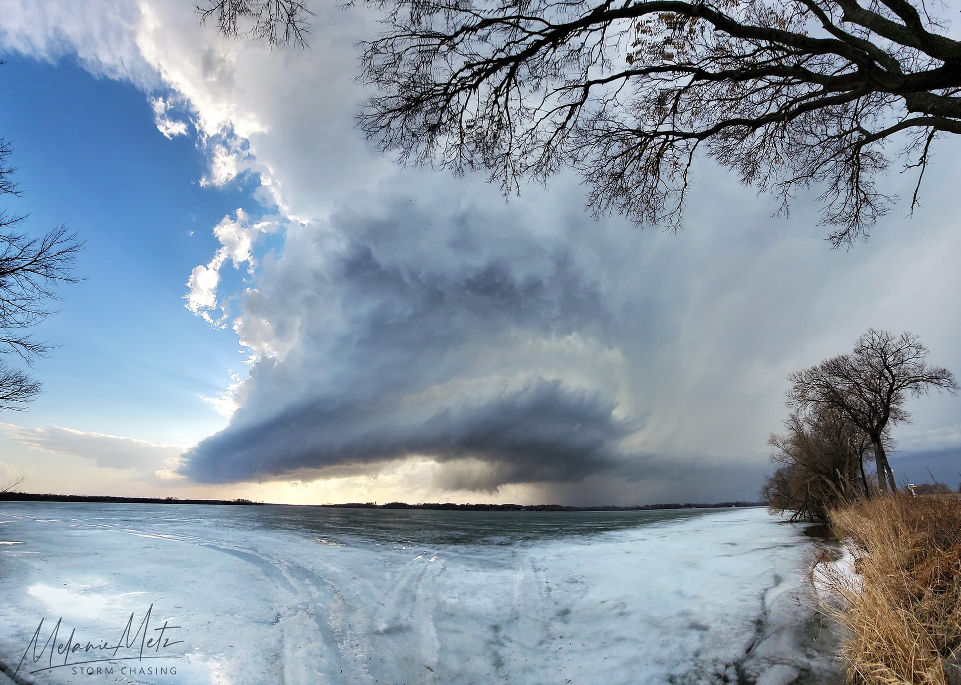 Orage supercellulaire en « tornado warning » au-dessus d'un lac gelé ce 10 mars 2021 dans le Minnesota – Photographie Melanie Lorraine Metz