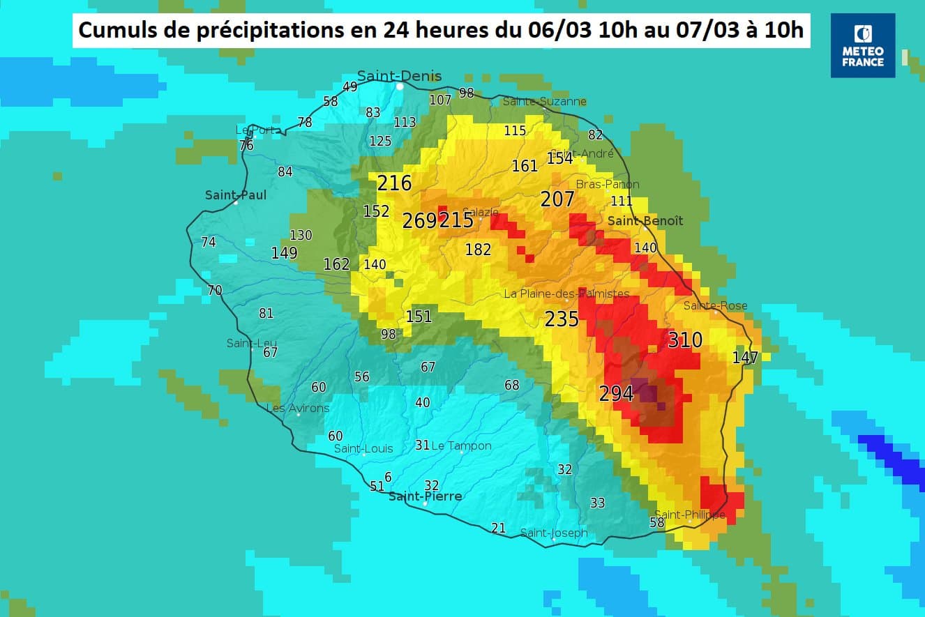 Cumuls de pluie relevés du 06/03 au 07/03 sur l’île de la Réunion – Via Météo-France