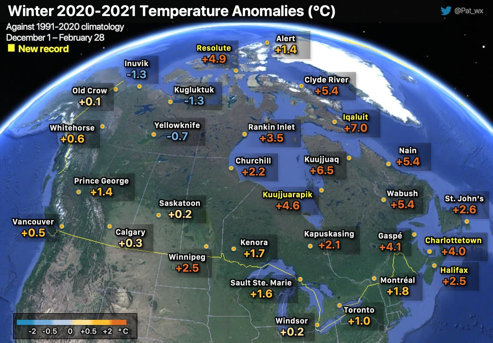 Anomalies de températures sur l’hiver 2020/2021 au Canada – Via twitter : @Pat_wx