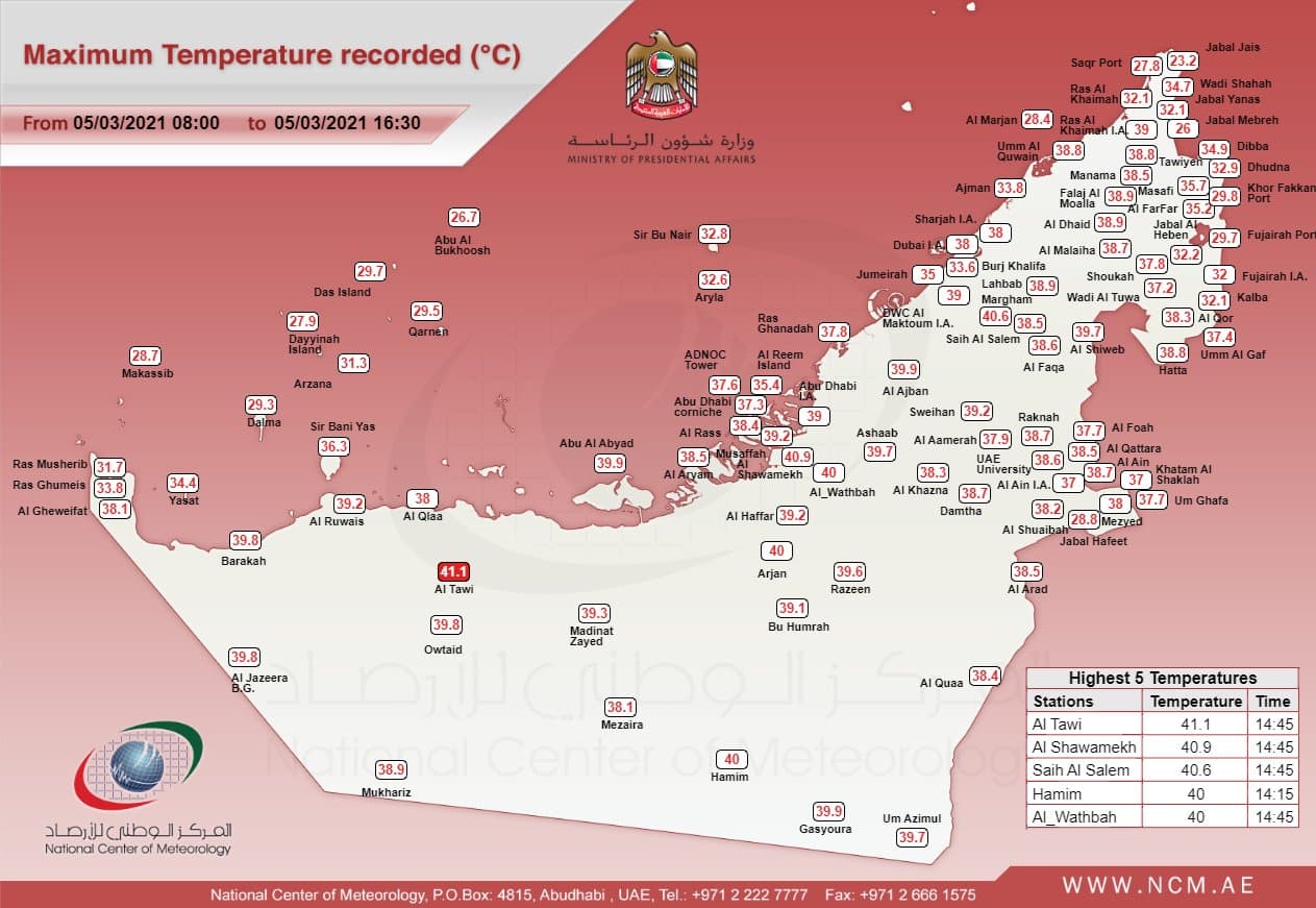 Températures maximales relevées le 5 mars 2021 aux Emirats-Arabes-Unis – Via National Center of Meteorology
