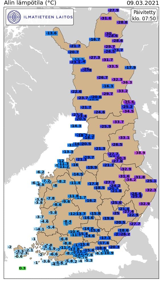 Températures minimales relevées en Finlande le 9 mars dernier – Via Ilmatieteen Laitos