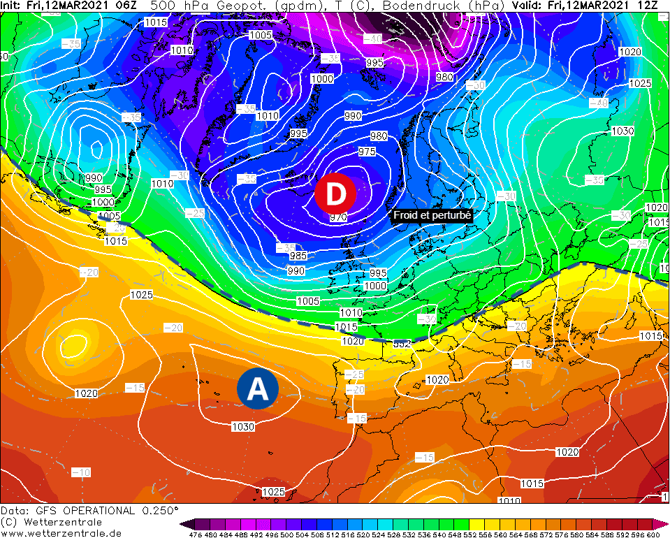 Schéma de la situation atmosphérique sur l’Europe ce vendredi 12 mars 2021 – Via Wetterzentrale