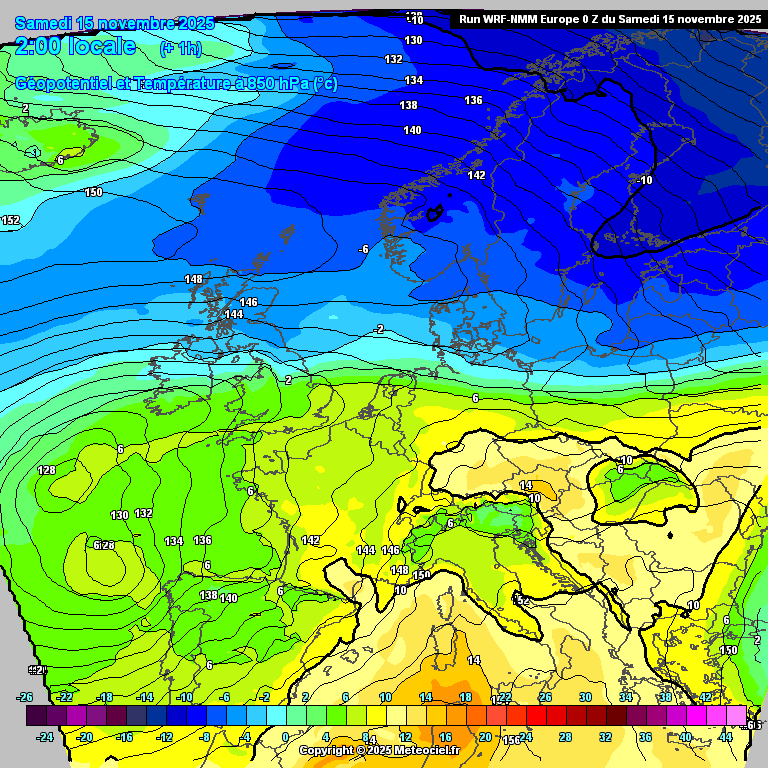 Progression de la descente froide polaire et évolution de la masse d'air à 850 hPa jusqu'à jeudi prochain - modèle météo WRF Meteociel