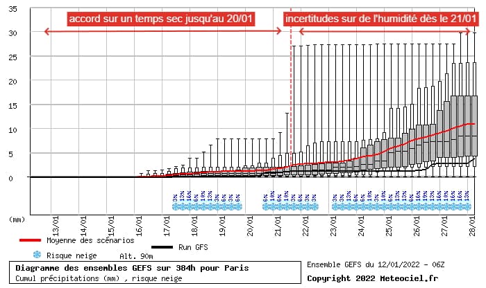 Les conditions anticycloniques et sèches (mais pas forcément ensoleillées) semblent donc acquises jusqu'aux alentours du 20 janvier 2022. Cependant, des doutes apparaissent quant à la dernière décade du mois de janvier. En effet, les ensemblistes (ensemble des scénarios simulés par un modèle de prévision) montrent de fortes disparités entre les modélisations à compter du 21 janvier 2022, faisant apparaître des scénarios plus humides pour la dernière décade du mois.