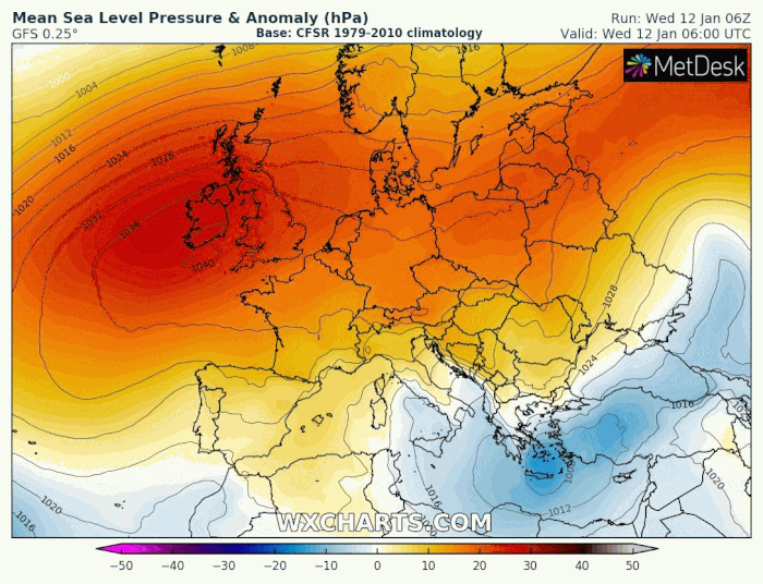 Anomalies de pressions (anticyclone en jaune/orange/rouge) du 12 au 20 janvier 2022 - via wxcharts.com
